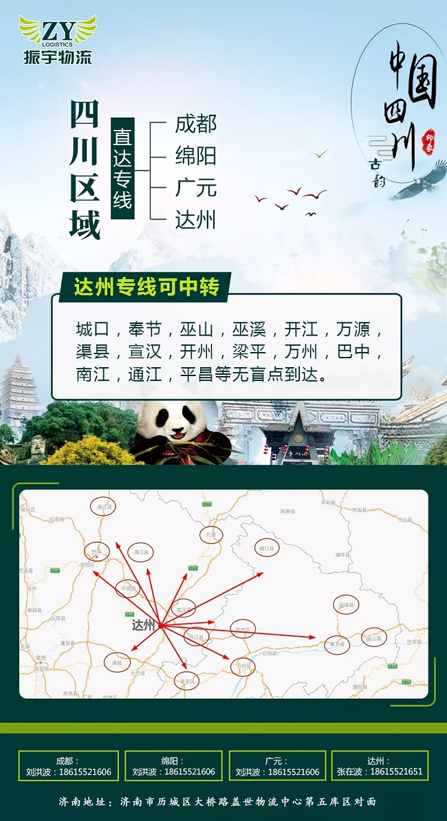 达州专线可中转城口,奉节,巫山,巫溪,开江,万源,渠县,宣汉,开州,梁平,万州,巴中,南江,通江,平昌等无盲点到达,解决大件异行设备的中转困难!