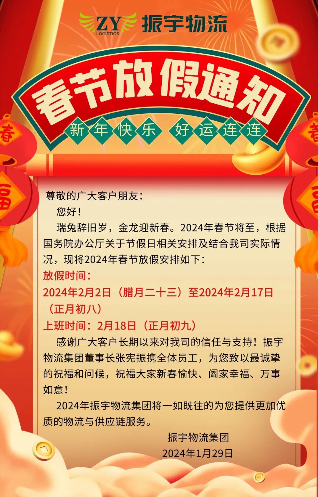 瑞兔辞旧岁,金龙迎新春。2024年春节将至,根据国务院办公厅关于节假日相关安排及结合我司实际情况,现将2024年春节放假安排如下: