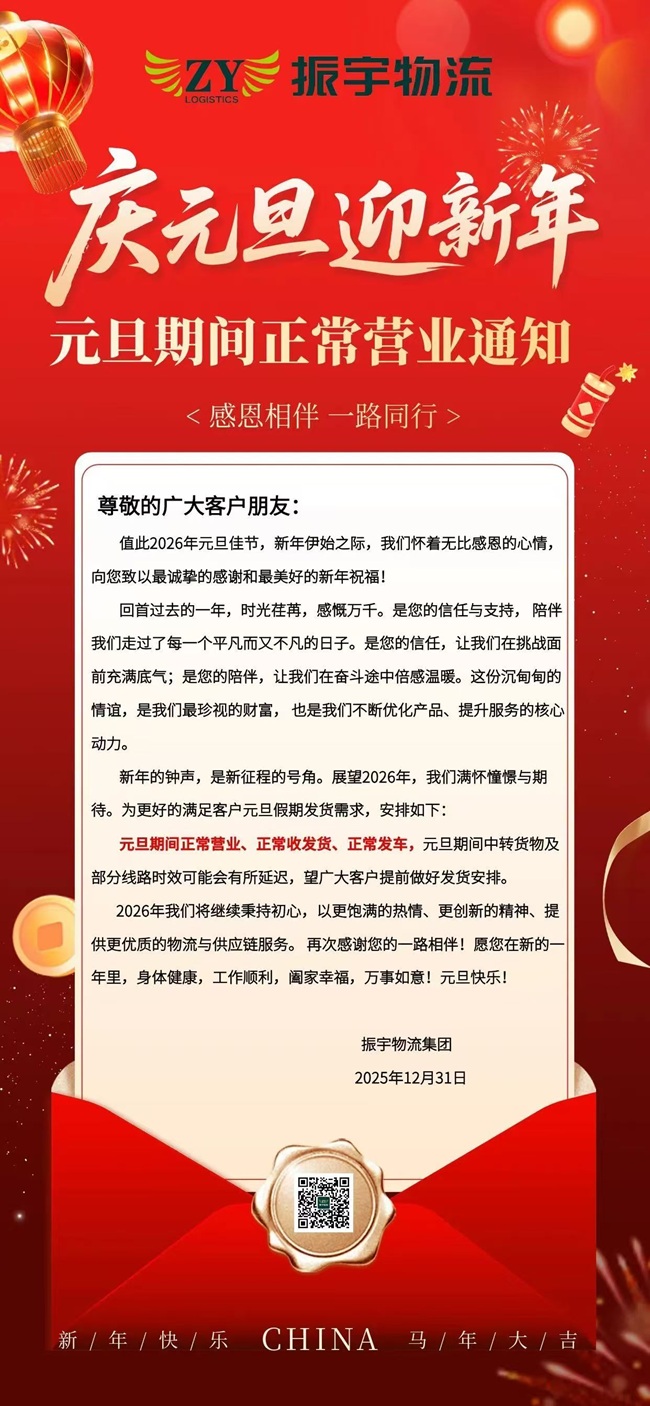 2026年我们将继续秉持初心,以更饱满的热情、更创新的精神、提供更优质的物流与供应链服务。再次感谢您的一路相伴!愿您在新的一年里,身体健康,工作顺利,阖家幸福,万事如意!元旦快乐!