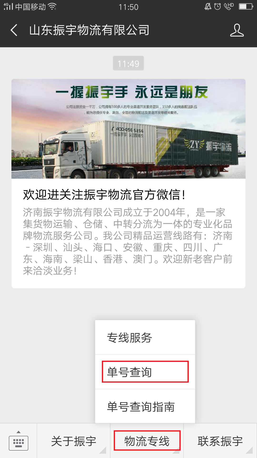 3.进入公众号,点击“物流专线——单号查询”栏目。