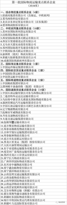 按照运力资源充足、网络覆盖健全、运输组织高效、经营信誉良好的原则,经各有关部门及沿边省份交通运输主管部门推荐,确定54家企业作为第一批国际物流运输重点联系企业,其中,综合物流企业4家、中欧班列运营企业10家、国际航运企业1家、国际航空货运企业2家、国际寄递物流企业2家、国际道路运输企业35家。包括招商局集团、菜鸟网络、京东集团、德邦股份、中远海运、中国邮政集团、顺丰、国货航等企业入围。