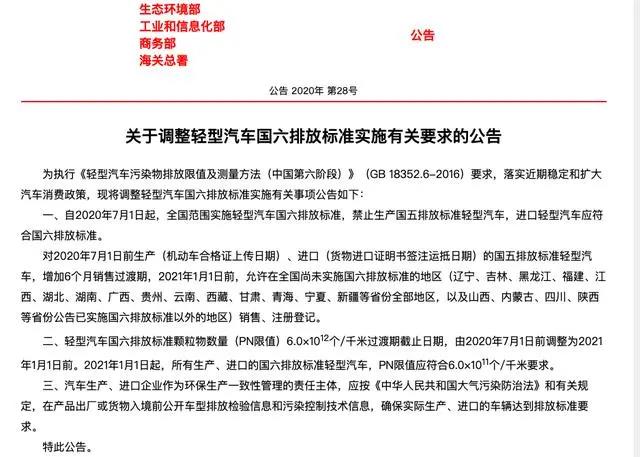 5月15日,据生态环境部网站消息,生态环境部等四部门联合发布关于调整轻型汽车国六排放标准实施有关要求的公告,自2020年7月1日起,全国范围实施轻型汽车国六排放标准,禁止生产国五排放标准轻型汽车,进口轻型汽车应符合国六排放标准。