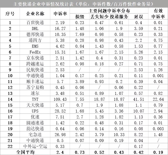 全国快递企业申诉率(百万件快件业务量)平均为2.40,有效申诉率平均为0.19。用户对快递企业申诉主要问题中,快件损毁申诉率平均为0.73,快件丢失短少申诉率平均为0.52,投递服务申诉率平均为0.43,快件延误申诉率平均为0.42。