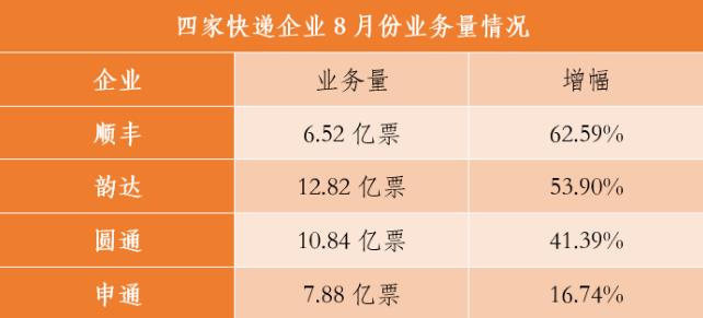 9月18日晚间,顺丰控股、圆通速递、韵达股份和申通快递四家企业发布8月经营简报。数据显示,四家快递企业继续保持高速增长。其中,顺丰业务量增幅继续领跑,韵达连续五个月、圆通连续四个月单月业务量破10亿票。