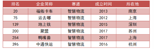 另外,排名前100的企业有第20位的福佑卡车和第75位的运去哪。福佑卡车作为技术驱动型公路货运平台,近日已赴美递交IPO申请,计划在纳斯达克上市。而一站式国际物流在线服务平台于前日宣布获得中信资本领投,襄禾资本和老股东跟投的新一轮融资,D1轮累计融资额达1.5亿美元,总融资金额超过了3亿美元。