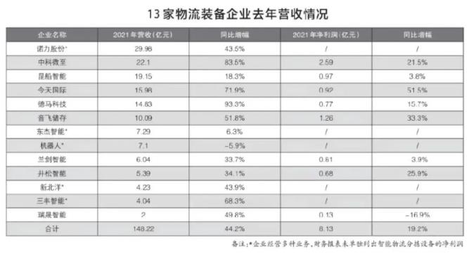 截至4月30日,A股主要上市企业均发布年报,其中包括以智能物流分拣系统为主要业务的11家企业,加之即将IPO的2家企业披露全年业绩,13家企业2021年营收合计为148.1亿元,2020年为102.8亿元,增长44.2%(见图表)。