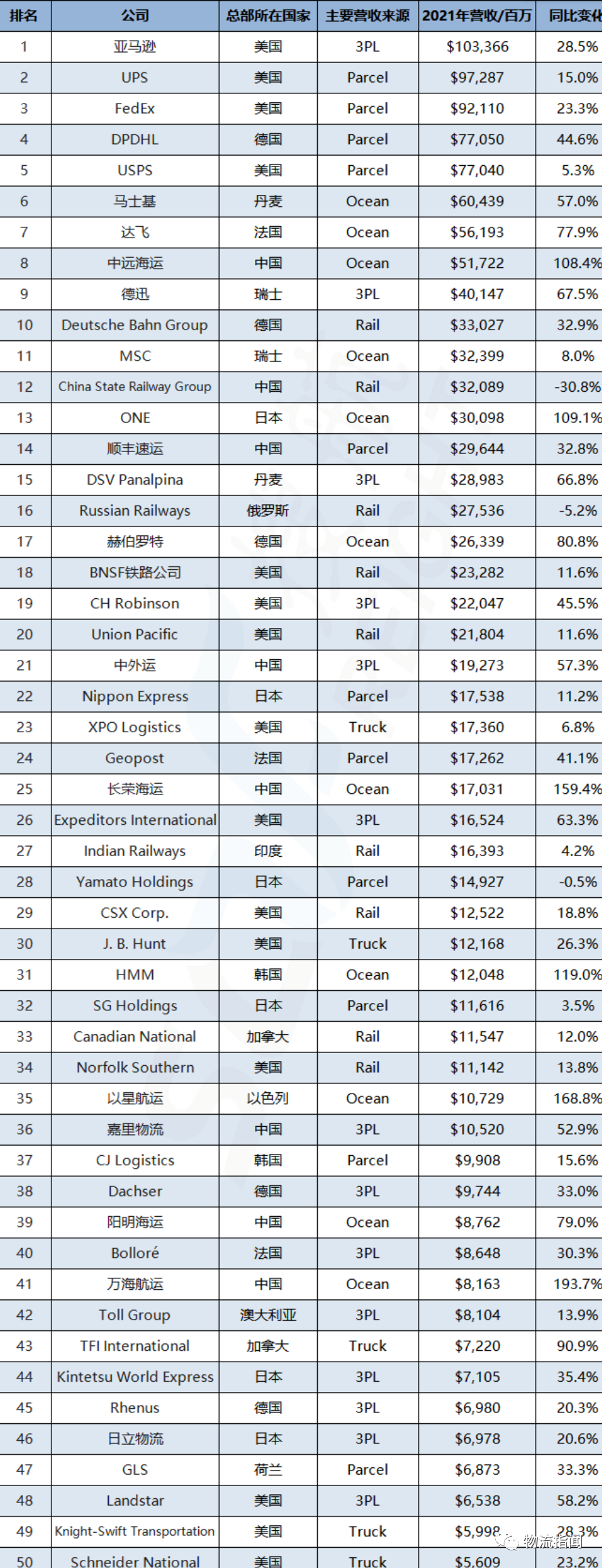 据了解,全球50大运输供应商2021年的总收入达到了1.29万亿美元,同比增长31.4%,创历史新高。50家企业中有47家实现了年度增长。