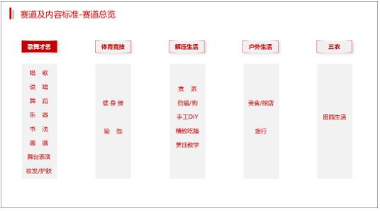 根据京东推出的主播招募政策,面向歌舞才艺、体育竞技、解压生活、户外生活、三农五个大赛道下的17个细分赛道招募内容型主播。从政策细则来看,京东对每个细分赛道都做了具体的“内容标准”要求,包括直播场景、音画质量、主播状态、直播内容等等。