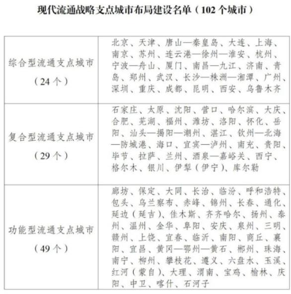 《通知》坚持系统思维和全局观念,突出国家所需和城市所长,按照服务重要商品和资源要素流通、强化跨域跨界辐射带动、促进现代流通发展等三个维度布局流通支点城市。综合考虑城市资源禀赋、发展基础、比较优势、未来潜力,将102个城市纳入布局建设范围,覆盖全国31个省区市以及新疆生产建设兵团。流通支点城市将按综合型、复合型、功能型分类推进建设,城市人民政府发挥主体作用部署推进,努力提升自身发展水平,增强辐射带动作用。