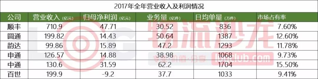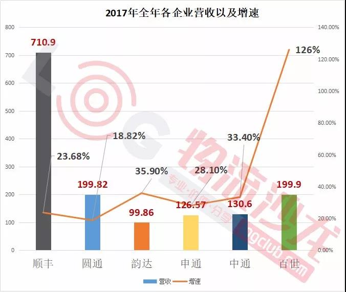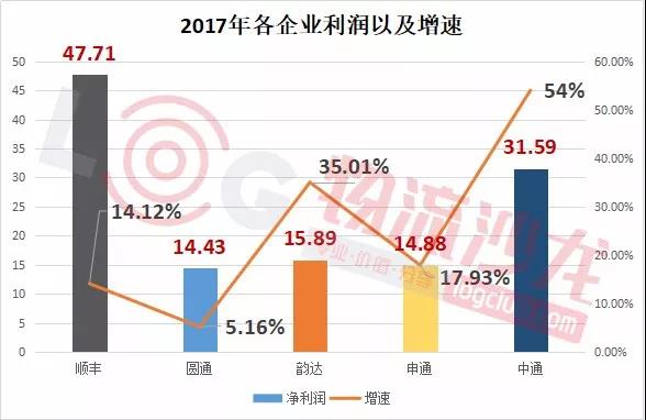 我们可以从营收增速来看看各家企业表现力。具体来看,百世第一,增幅高达126%,其次是韵达、中通、申通,分别是35.9%、33.4%、28.1%,都高于邮政局公布的2017年全年快递收入增长速度(2017年行业增速为24.7%)。