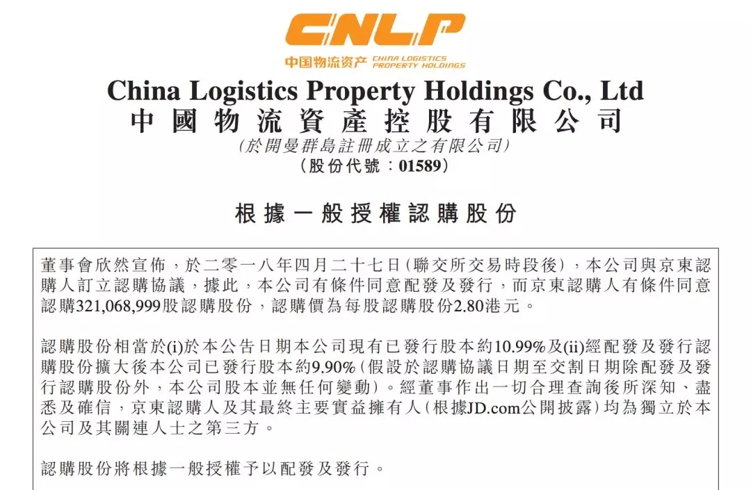 中国物流资产控股有限公司近日宣布,已与京东认购人订立股份认购协议,京东认购人为JD.com, Inc.子公司。