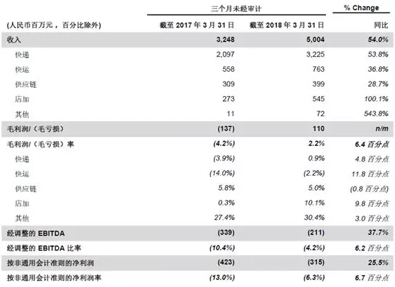 5月10日,百世集团公布2018年第一季度未经审计财务业绩:一季度总收入50.04亿元人民币,同比增长54%;毛利润1.1亿元人民币,与去年同期相比提升6.4%。