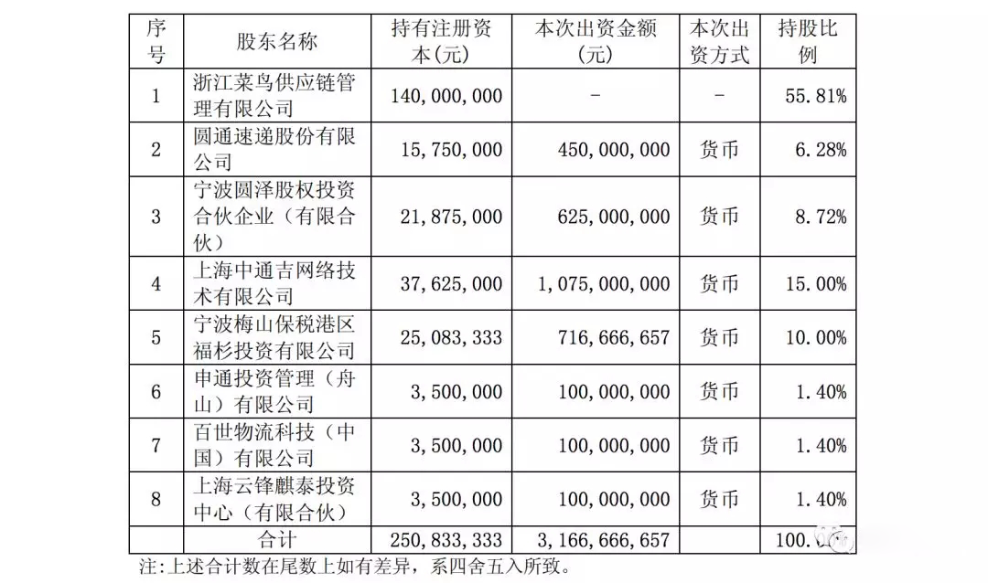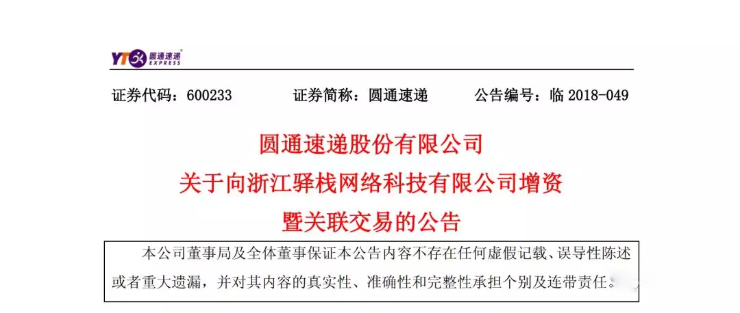 根据公告,圆通拟以自有资金4.5亿元人民币对浙江驿栈进行增资,其中1575万元人民币认缴新增注册资本,4.3425亿元人民币计入资本公积金。本次投资后,公司将持有浙江驿栈1575万元人民币注册资本,持股占增资完成后比例为6.28%。