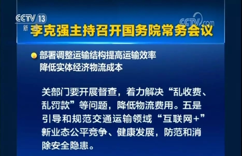 国务院总理李克强6月27日主持召开国务院常务会议,听取深入推进“互联网+农业”促进农村一二三产业融合发展情况汇报;部署调整运输结构提高运输效率,降低实体经济物流成本。会议指出,调整运输结构、提高综合运输效率,降低全社会物流成本,对提升实体经济竞争力至关重要。