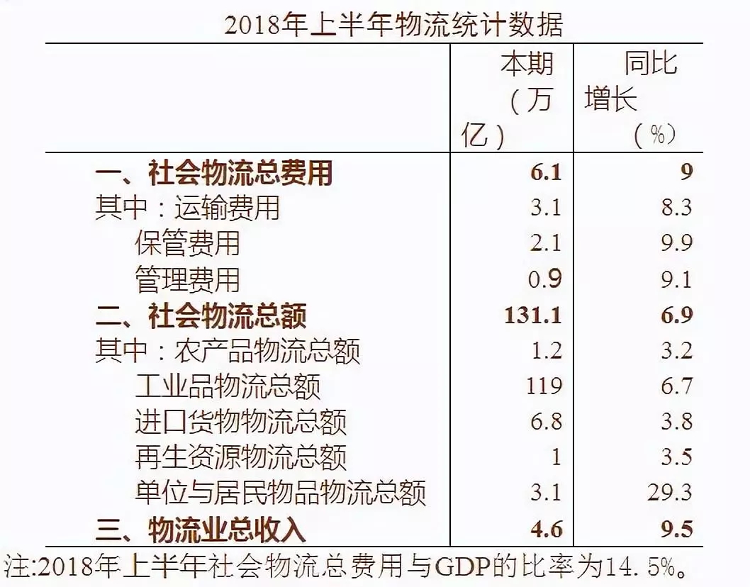 2018年1-6月,社会物流总费用为6.1万亿元,同比增长9%,增速比一季度提高2个百分点;物流市场规模稳步增长,物流业总收入为4.6万亿元,同比增长9.5%,增速比一季度提高1.3个百分点。