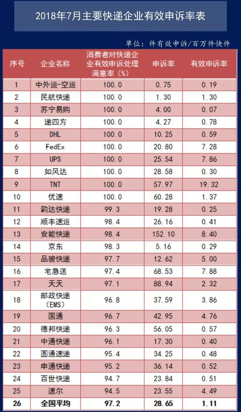 7月,消费者对快递企业有效申诉处理满意率(消费者对快递企业有效申诉处理满意件数与快递企业有效申诉总量之比)为97.2%,低于全国平均有效申诉处理满意率的快递企业有9家。