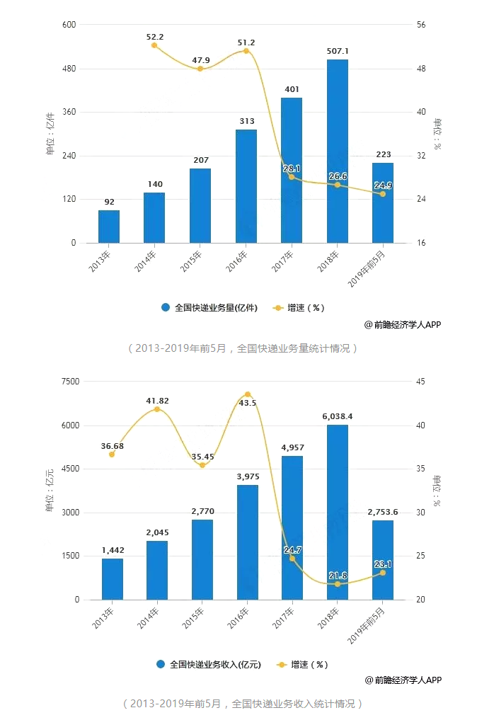 进入2019年5月,全国快递服务企业业务量为52.3亿件,同比增长25.2%;业务收入达618.1亿元,同比增长24.2%。累计方面,2019年1-5月,全国快递服务企业业务量累计达到223亿件,同比增长24.9%;业务收入累计达到2753.6亿元,同比增长23.1%。