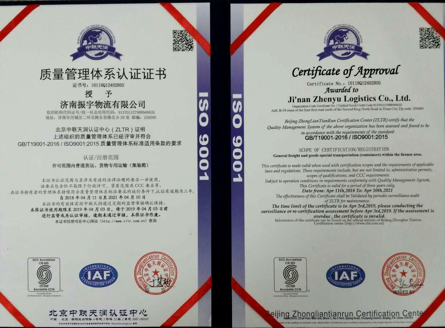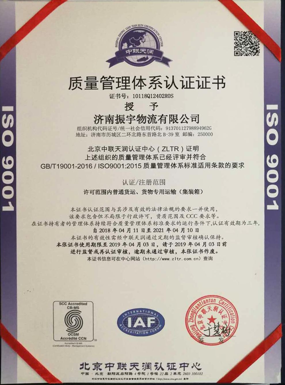 ISO 9001质量管理体系认证证书